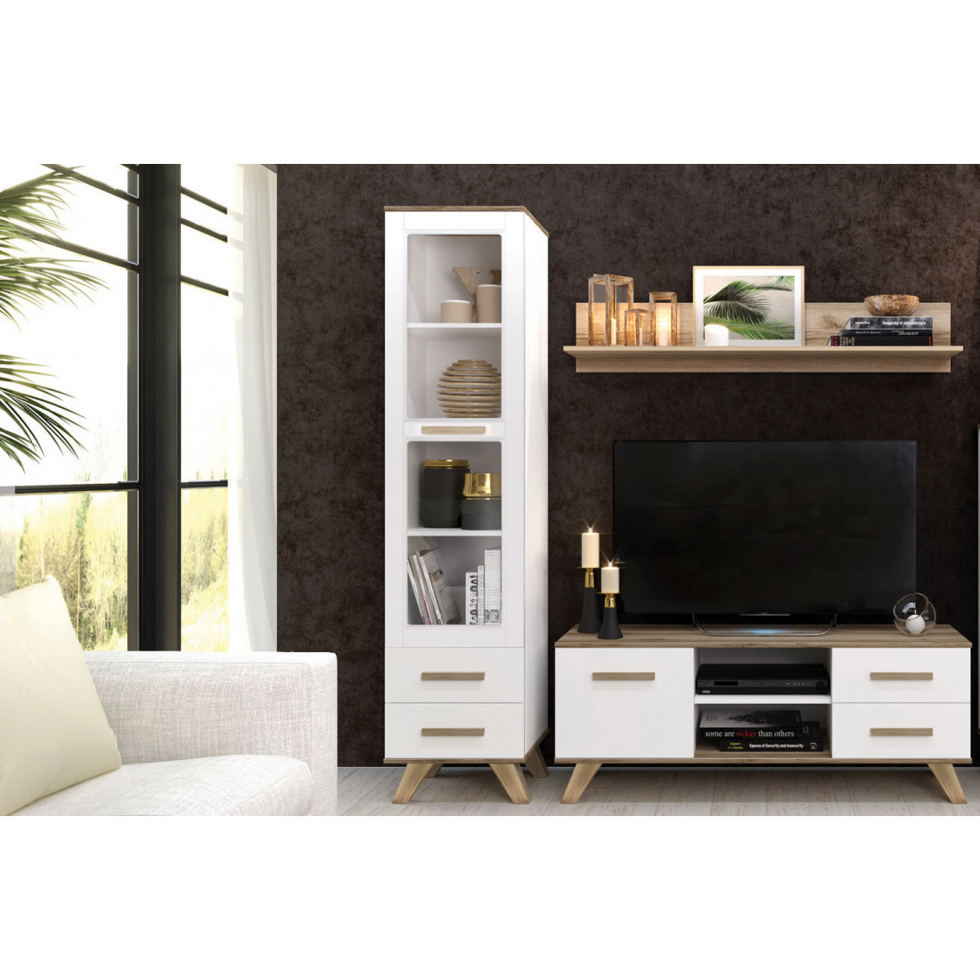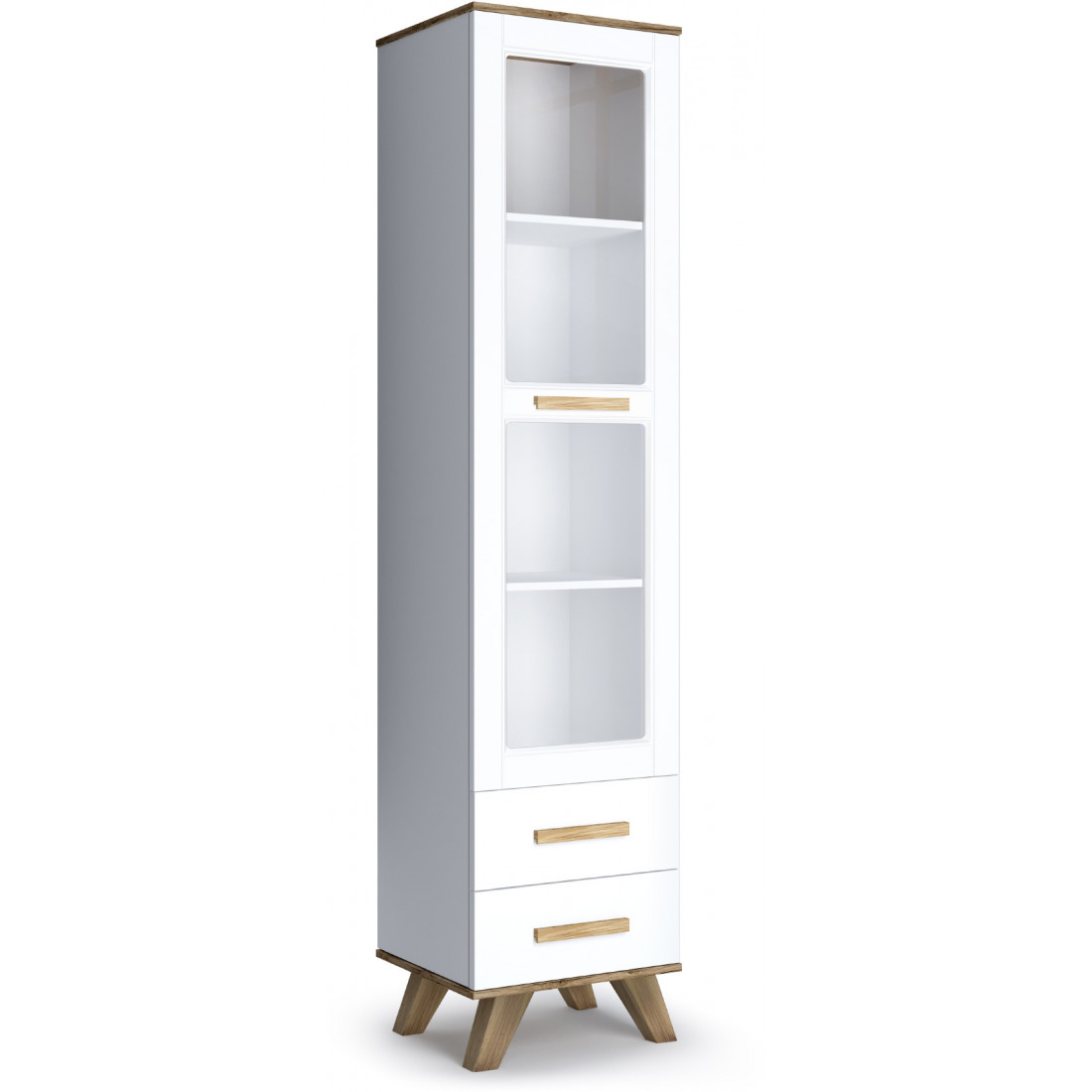 Узкая витрина «Вега Скандинавия» это геометрические формы и сочетание оттенков камня, песка, древесины, белого цвета.